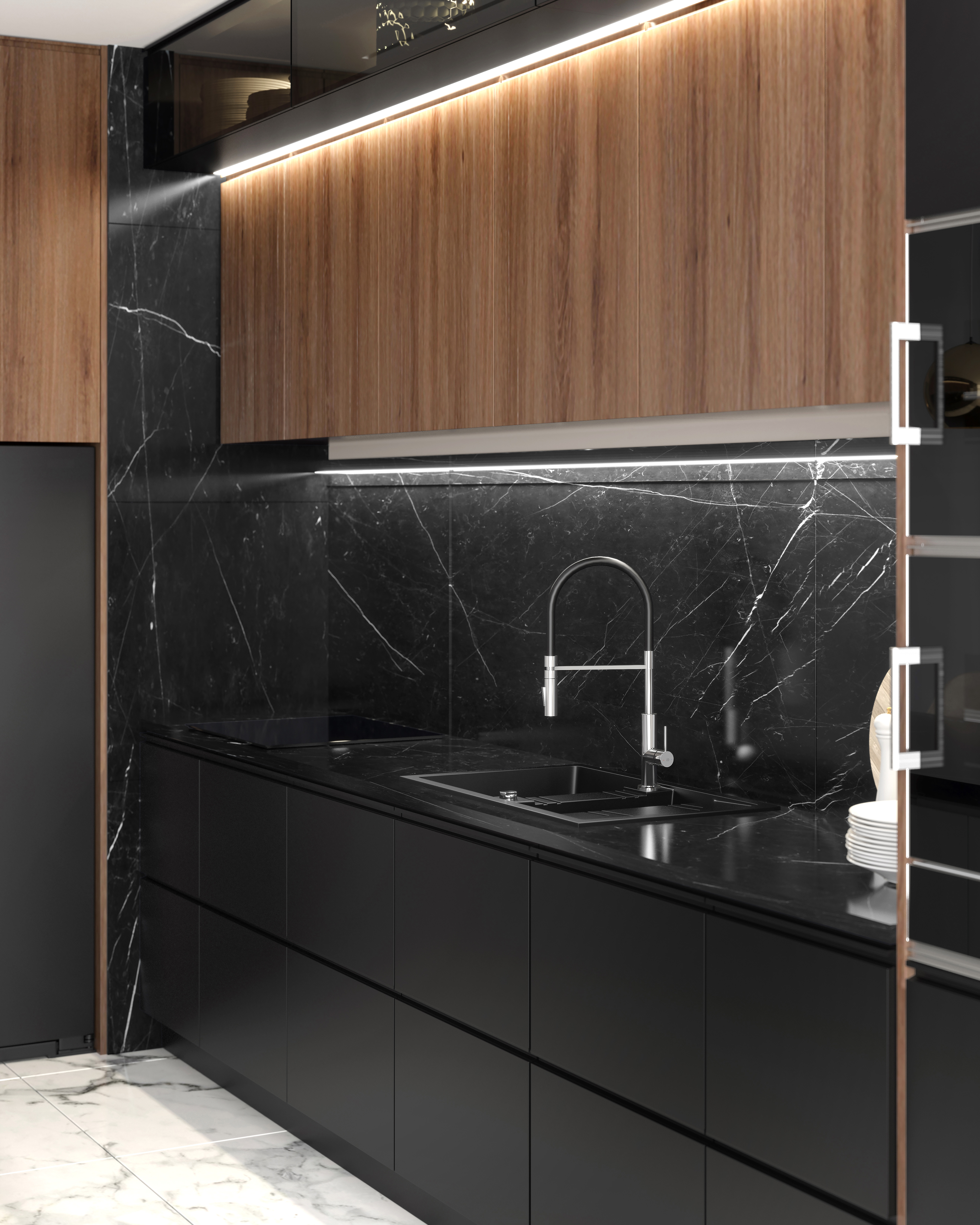 Bateria świetnie wpisuje się w nowoczesne aranżacje kuchenne. Ładny kształt i doskonałe proporcje w połączeniu z czarną barwą i błyszczącym chromem podkreślą elegancki charakter naszej kuchni. Będą również dobrze komponować się z elementami wyposażenia w ciemnym kolorze. Bateria posiada elastyczną, obrotową i wyciąganą wylewkę, która pozwoli nam na komfortowe zmywanie, a także napełnianie wodą naczyń ustawionych poza komorą zlewu.