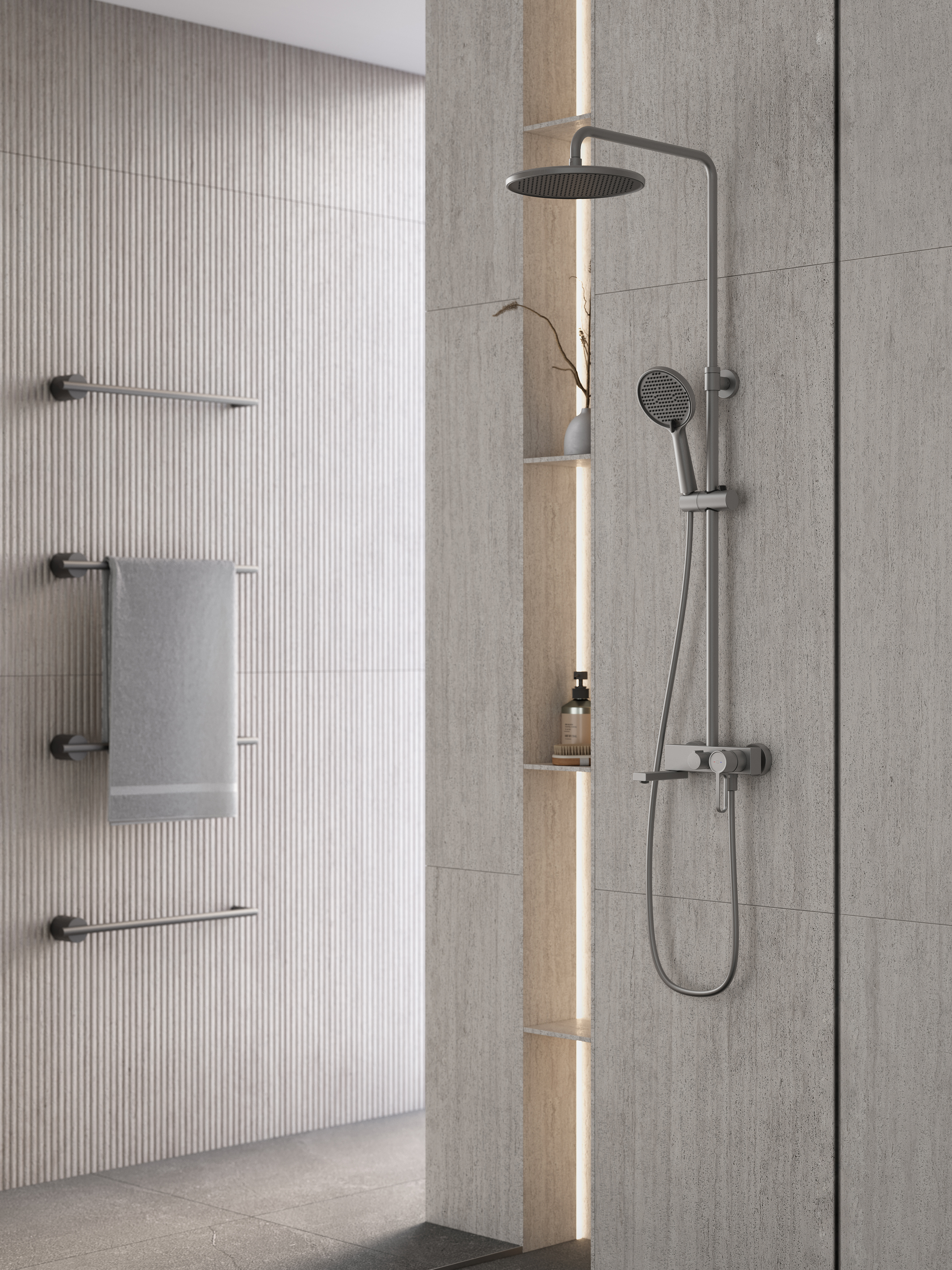 Wykończenie gun metal wyróżnia się nie tylko estetyką, ale także praktycznością – jest odporne na zarysowania i łatwe w utrzymaniu czystości. Kolumna natryskowa ZAFFIRO harmonijnie komponuje się z nowoczesną ceramiką, kamieniem, betonem architektonicznym czy ciemnymi płytkami, tworząc spójną i elegancką strefę kąpielową.